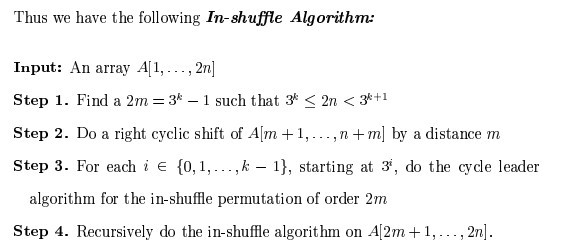 下面我要引用此论文“A Simple In-Place Algorithm for In-Shuffle”的一个结论了,即 对于2*n = (3^k-1)这种长度的数组,恰好只有k个圈,且每个圈头部的起始位置分别是1,3,9,...3^(k-1)。